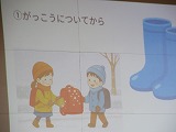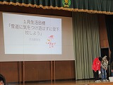 児童会生活委員会の子ども達が、雪道の登下校の仕方について大切な話を、発表形式で説明してくれました。