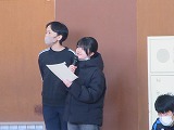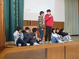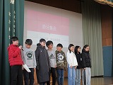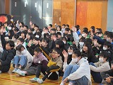 節分の由来や、豆をまいて鬼を追い払うこと、中には「鬼は内」という地方もあることなどを、自作のプレゼン画像と合わせてクイズ形式で発表しました。クイズに当たると、大喜びする声が体育館に響き、集会は盛り上がりました。