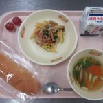 今日の献立は、チャーハン(麦入りご飯)、チンゲン菜のスープ、県産ヨーグルト、牛乳です。