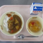 コッペパン、鶏肉のワイン煮、青のりポテト、ラビオリスープ、舘山りんご、牛乳です。