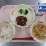 今日の給食は チキンライス、わかめスープ、牛乳 です。