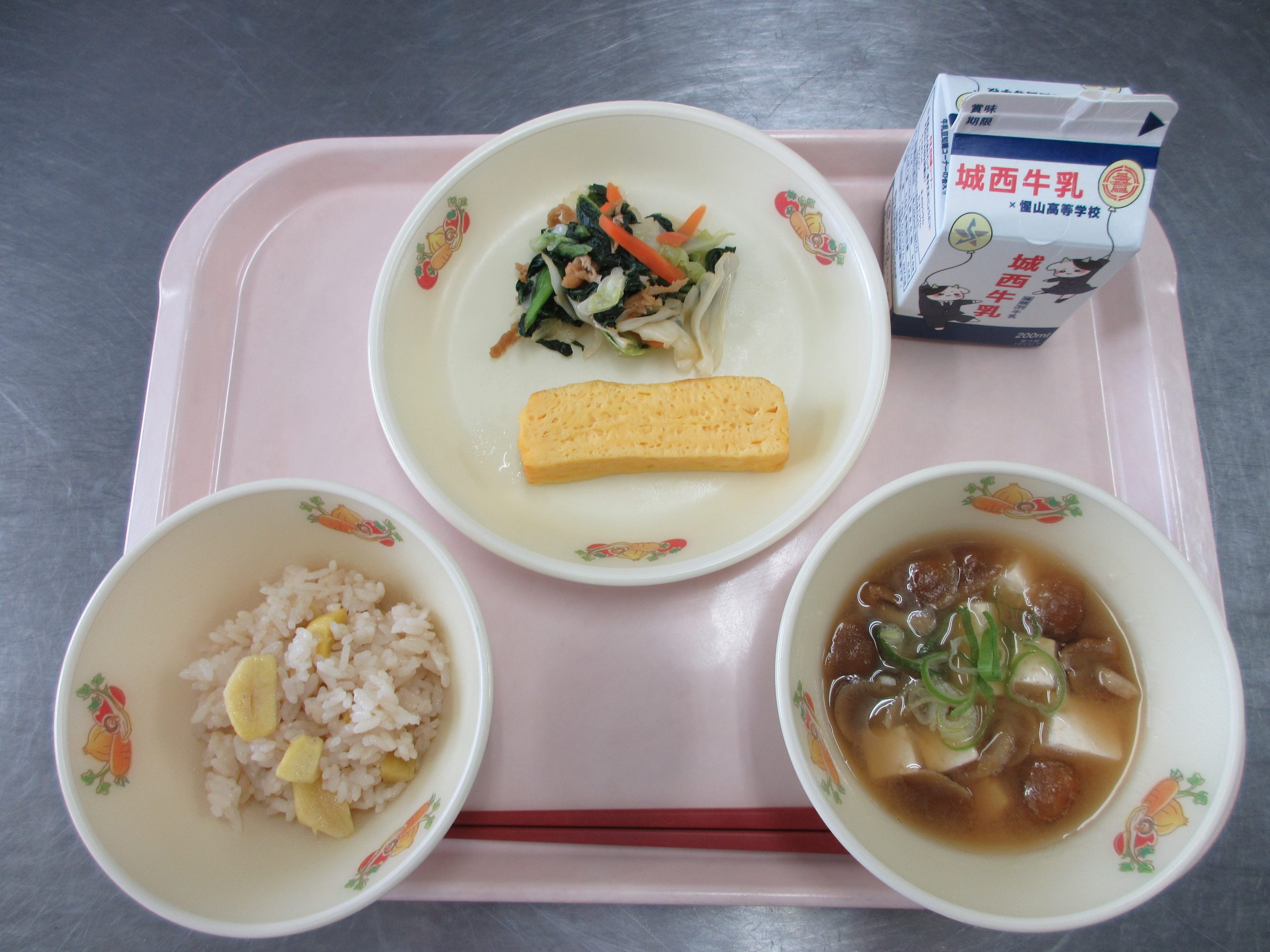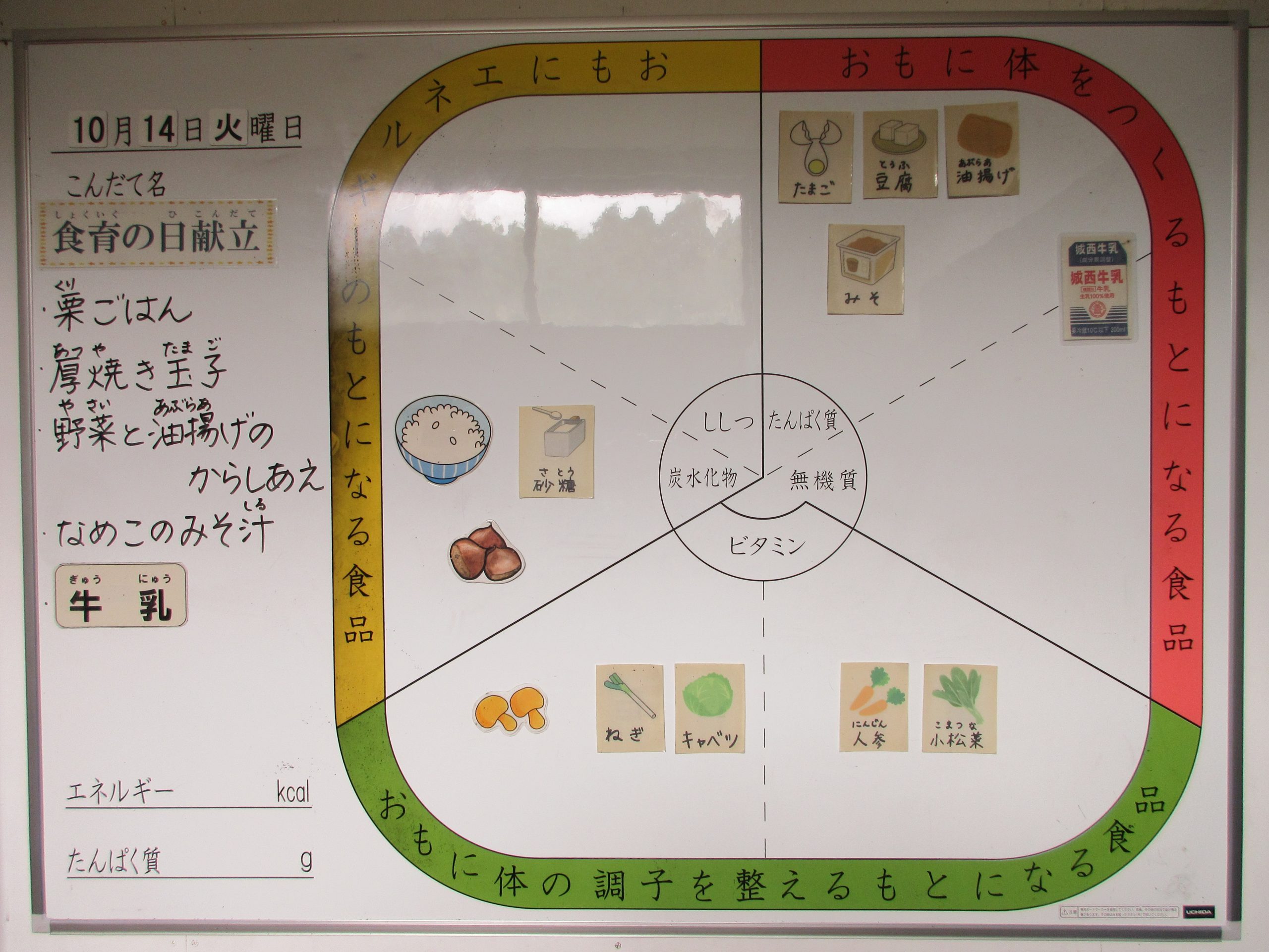 2025年10月14日 / 最終更新日時 : 2025年10月14日 toubusho 給食 10月14日(火) 今日の給食は【食育の日献立】 栗ごはん、厚焼き玉子、野菜と油揚げのからしあえ、なめこのみそ汁、牛乳 です。 Facebooktwitter