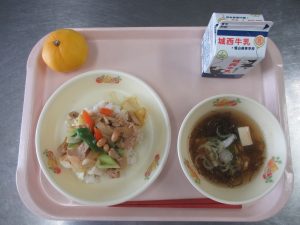 2025年10月21日 / 最終更新日時 : 2025年10月21日 toubusho 給食 10月21日(火) 今日の給食は【★減塩・ベジアップ献立】 玄米入りご飯、★いんげん豆入り焼き肉丼、もずくのみそ汁、みかん、牛乳 です。 Facebooktwitter
