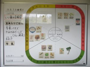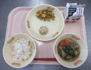 玄米入りご飯、多彩パオズ、かみかみビーンズ(カレー風味)、五目汁、牛乳 です。