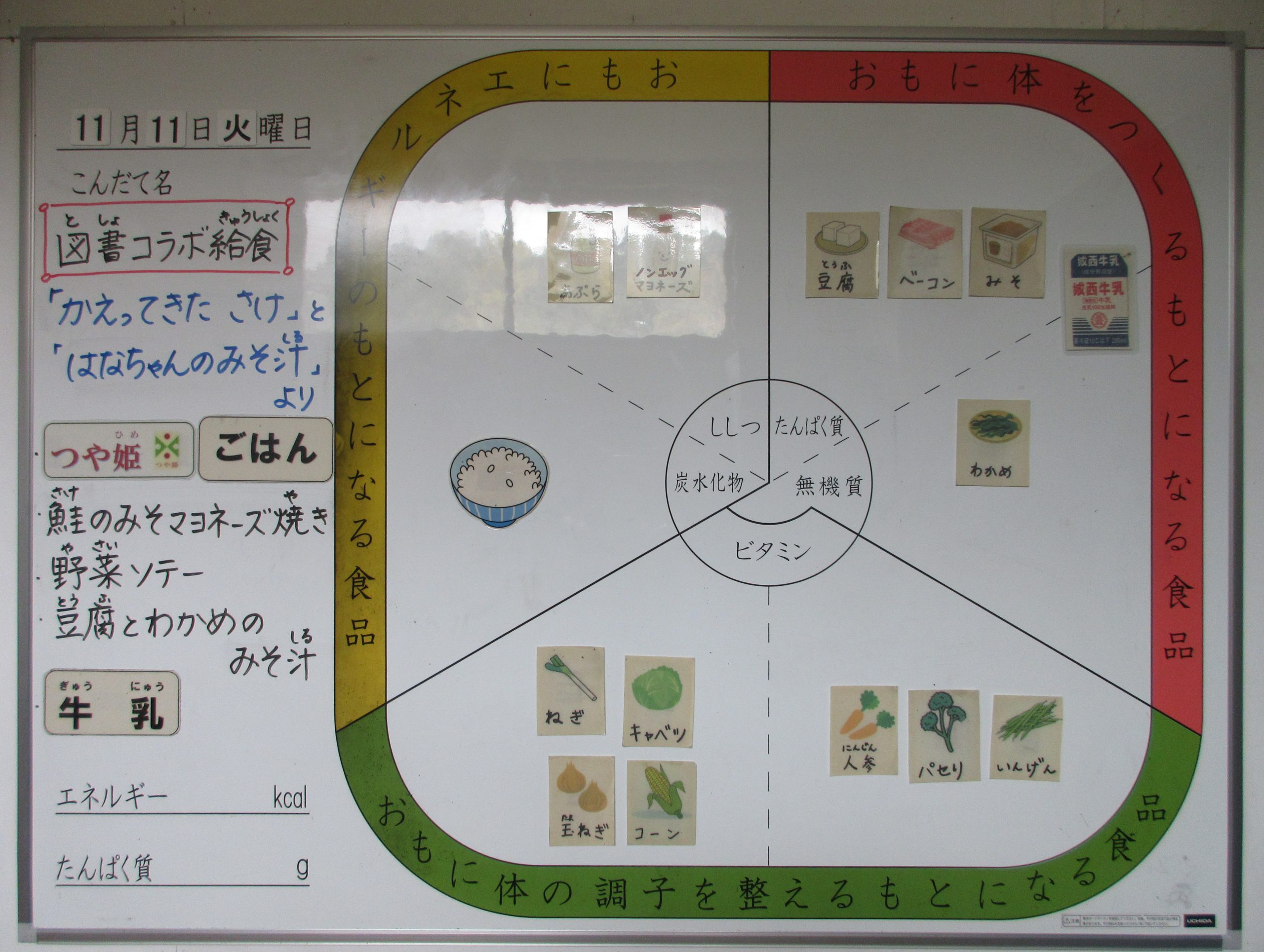 2025年11月12日 / 最終更新日時 : 2025年11月12日 toubusho 給食 11月11日(火) 今日の給食は【図書コラボ給食】「かえってきた さけ」&「はなちゃんのみそ汁」 つや姫ご飯 ★鮭のみそマヨネーズ焼き 野菜ソテー ★豆腐とわかめのみそ汁 牛乳 です。 Facebooktwitter