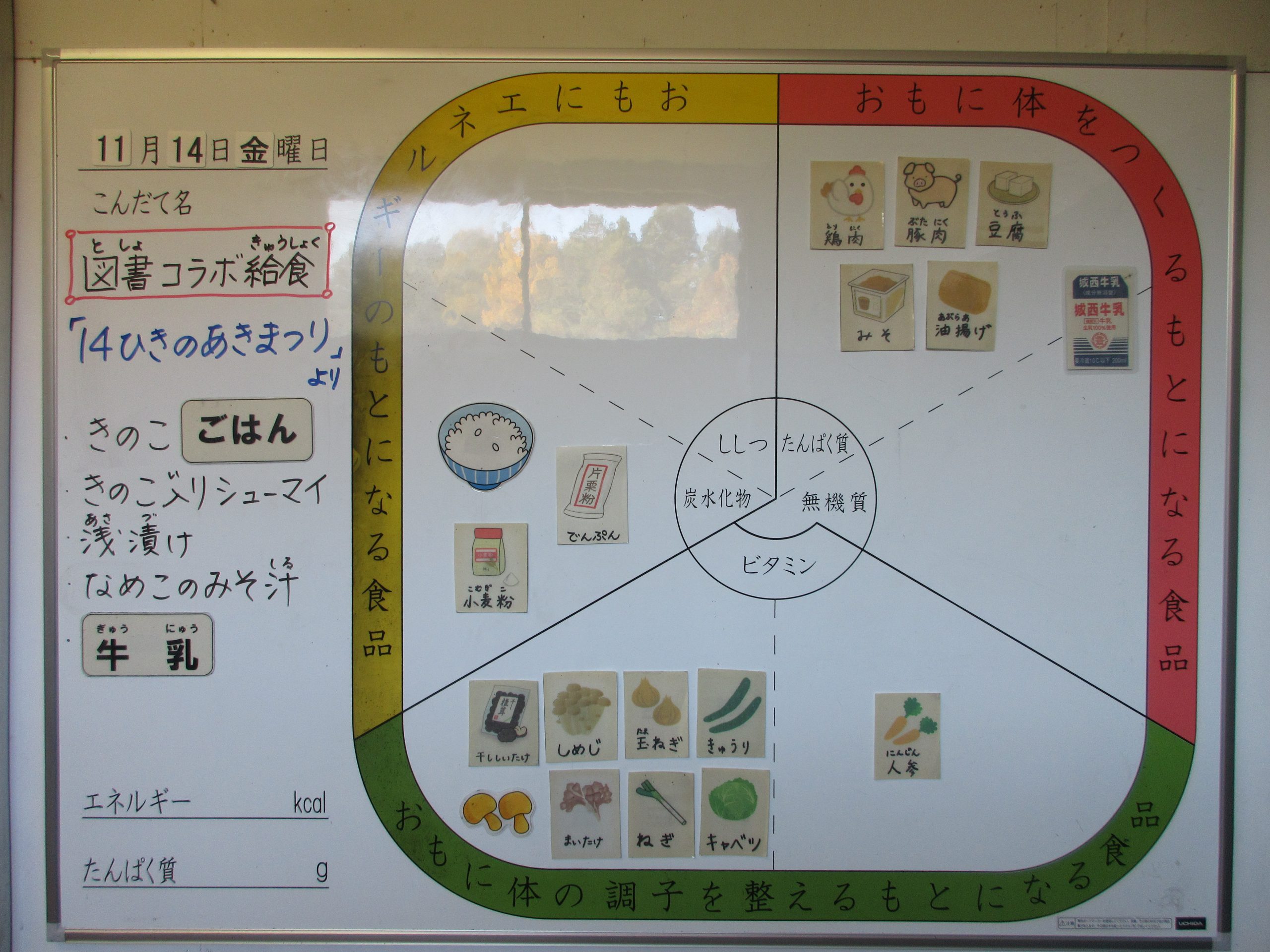今日の給食は【図書コラボ給食】「14ひきのあきまつり」より