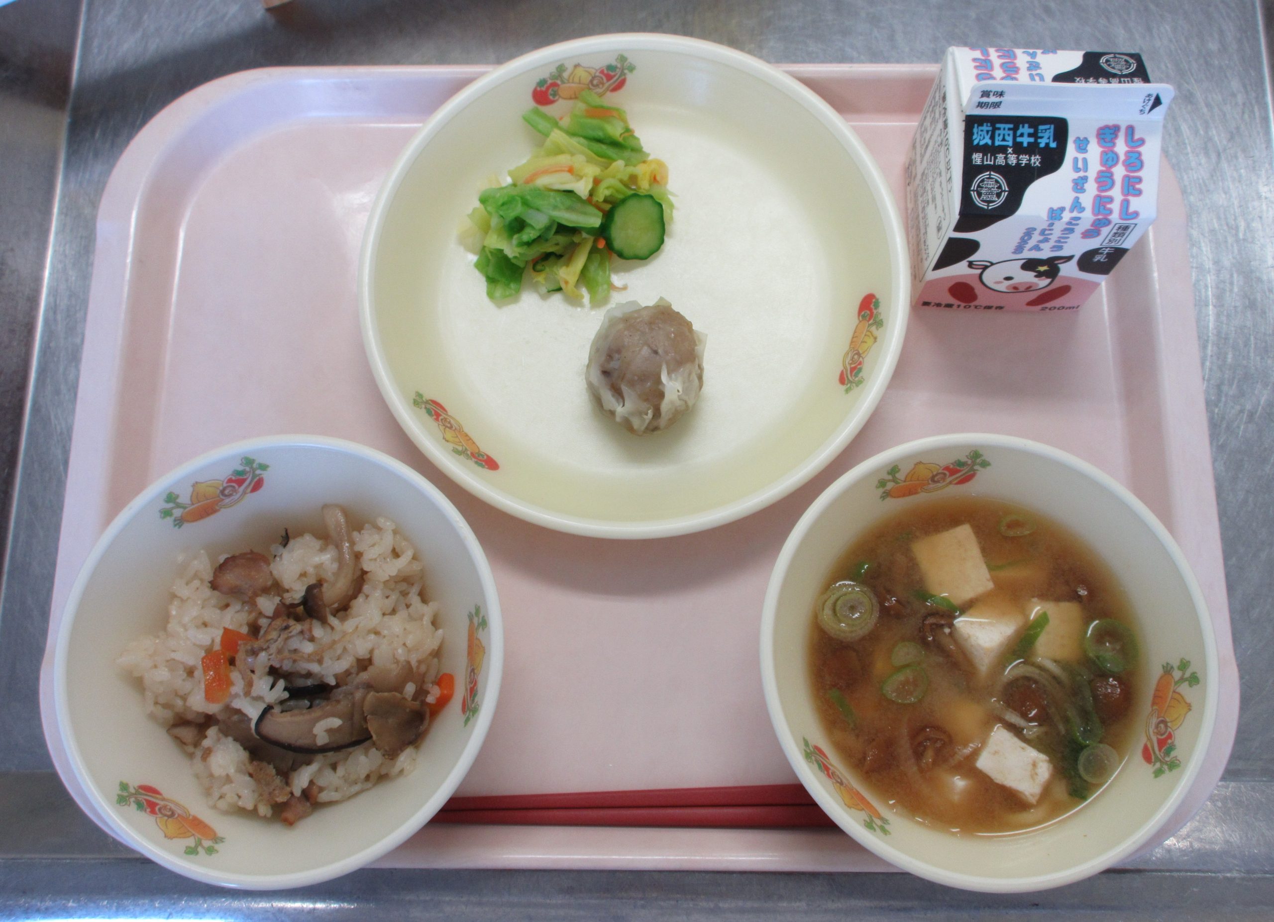 きのこご飯、きのこ入りシューマイ、浅漬け、なめこのみそ汁、牛乳 です。