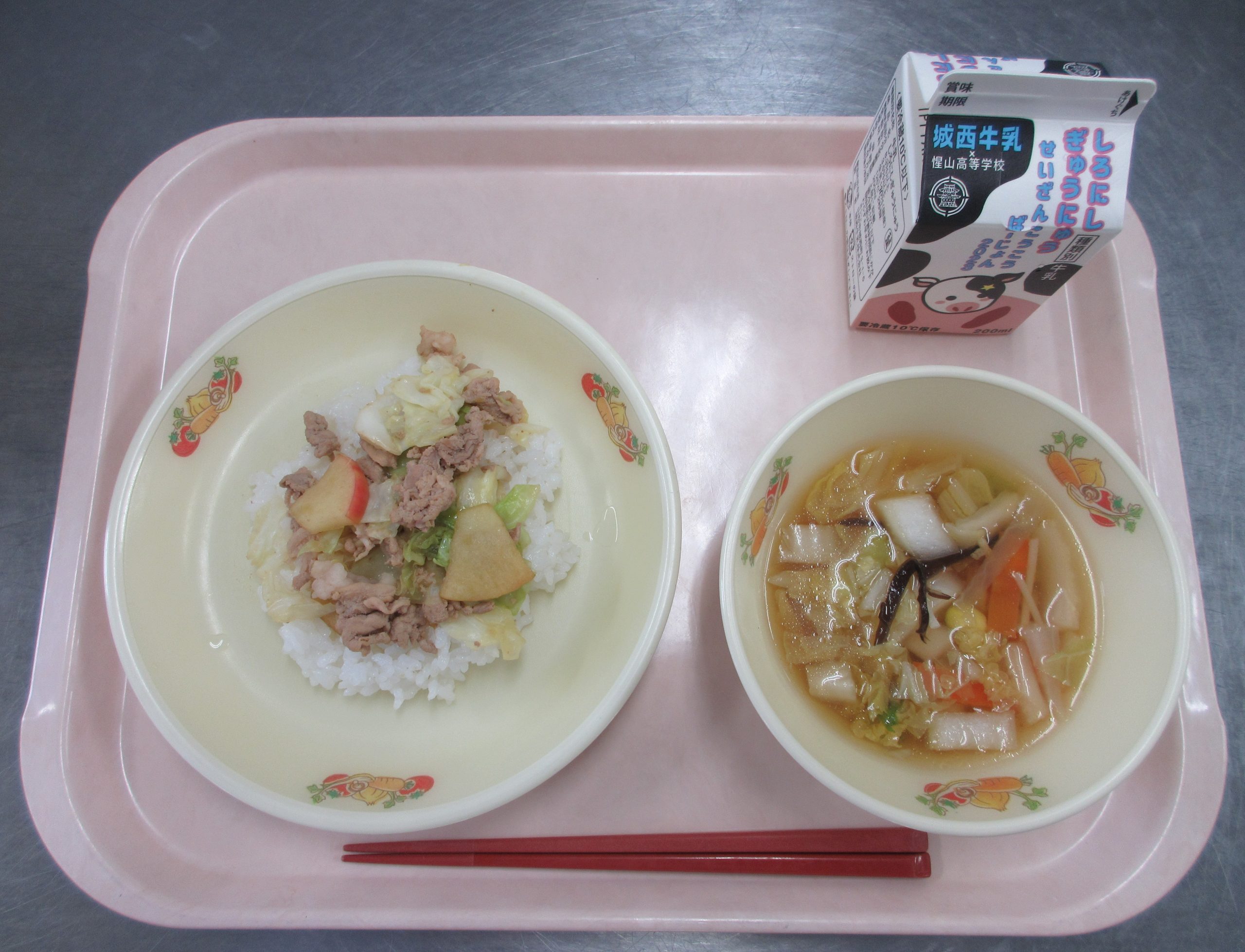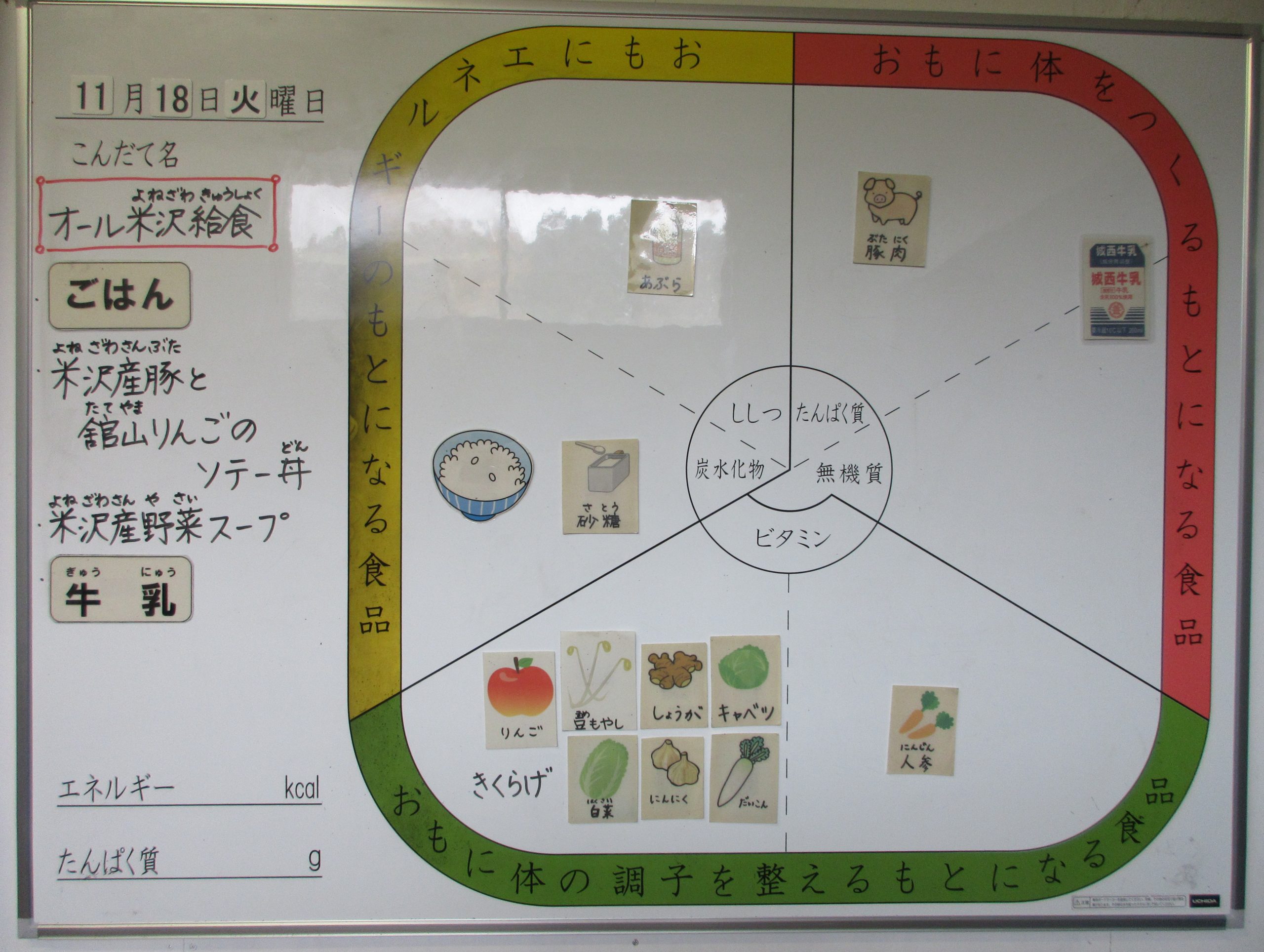2025年11月18日 / 最終更新日時 : 2025年11月18日 toubusho 給食 11月18日(火) 今日の給食は【オール米沢給食、食育の日献立】 ご飯、米沢産豚と舘山りんごのソテー丼、米沢産野菜スープ、牛乳 です。 Facebooktwitter