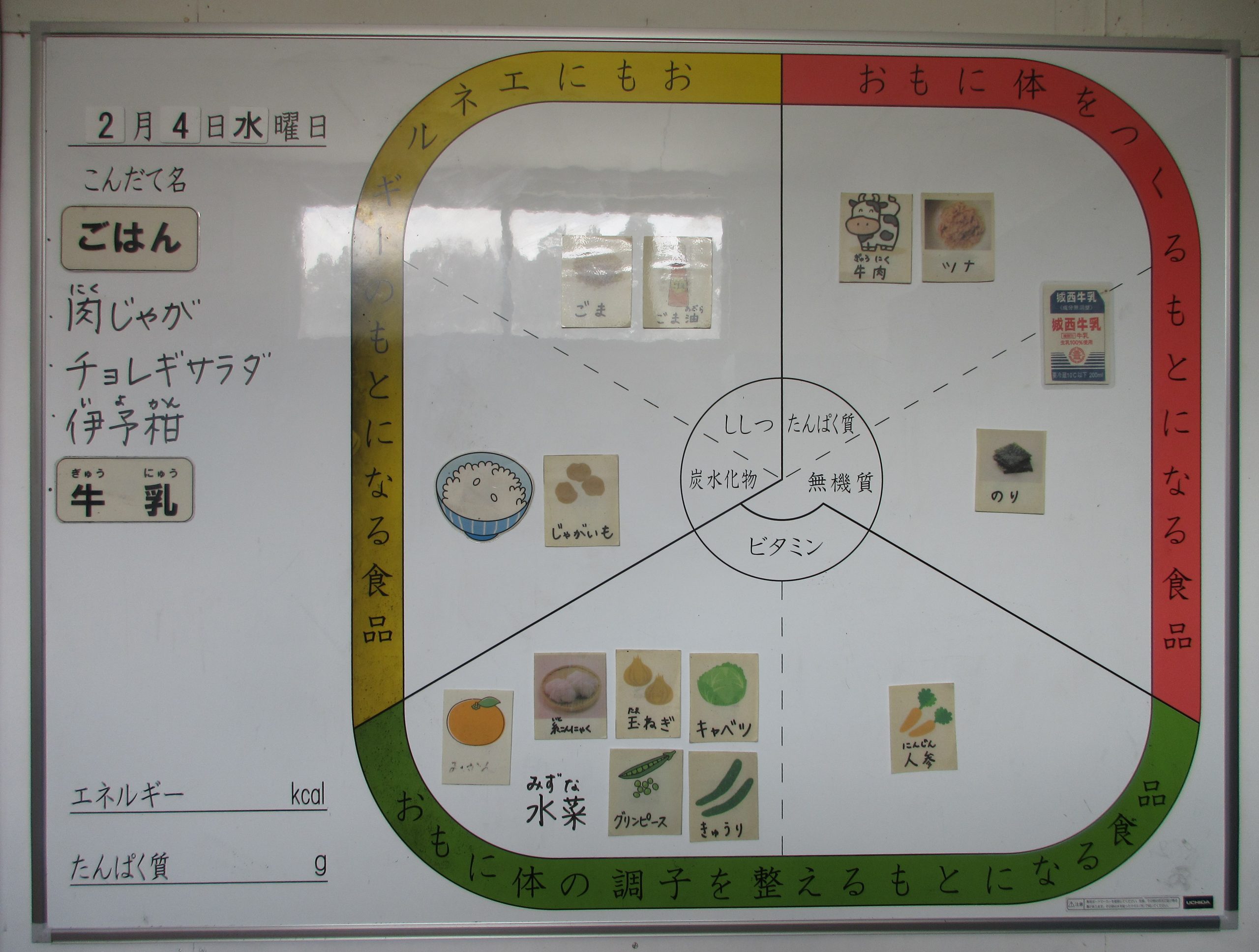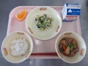 今日の給食は ご飯、肉じゃが、チョレギサラダ、伊予柑、牛乳 です。