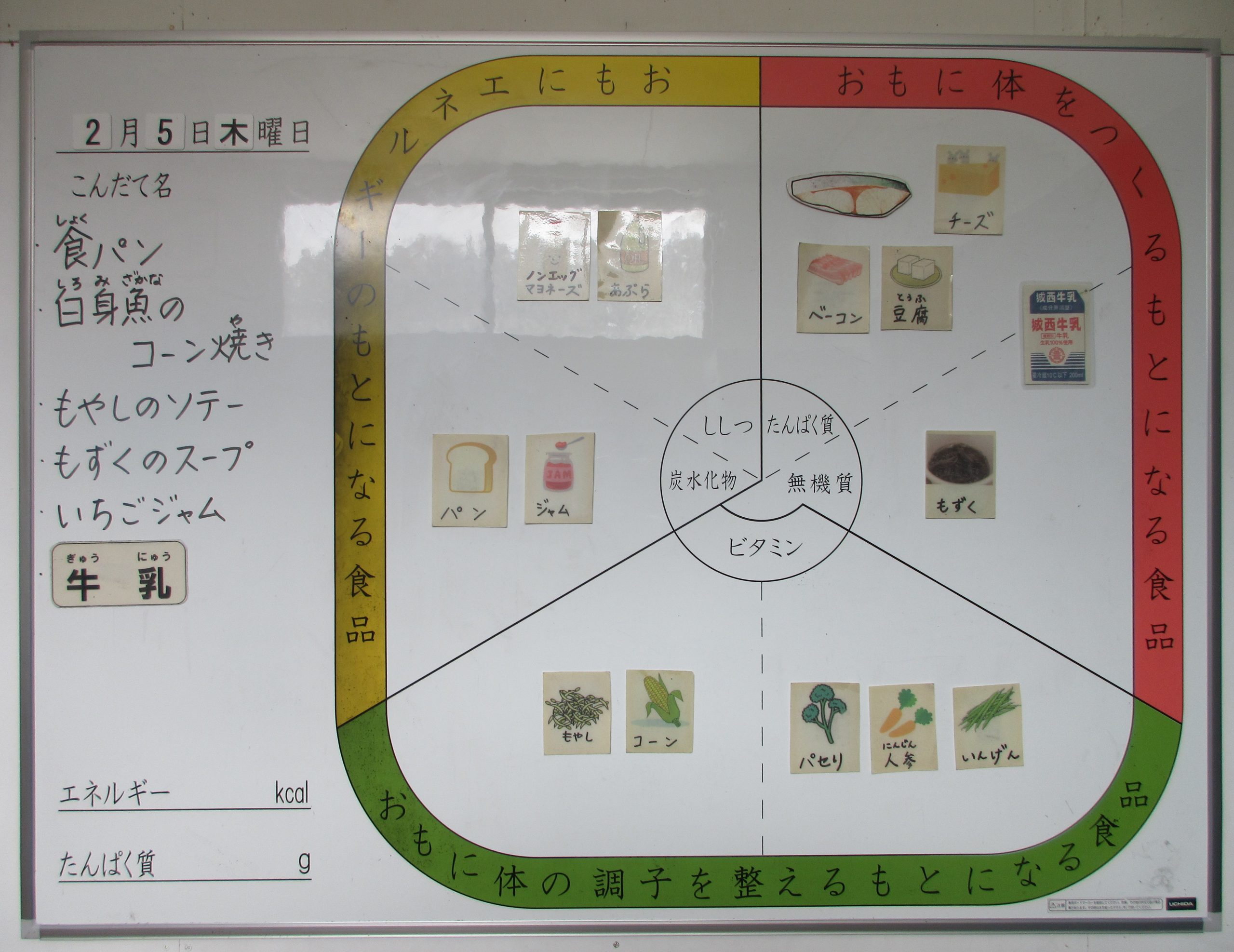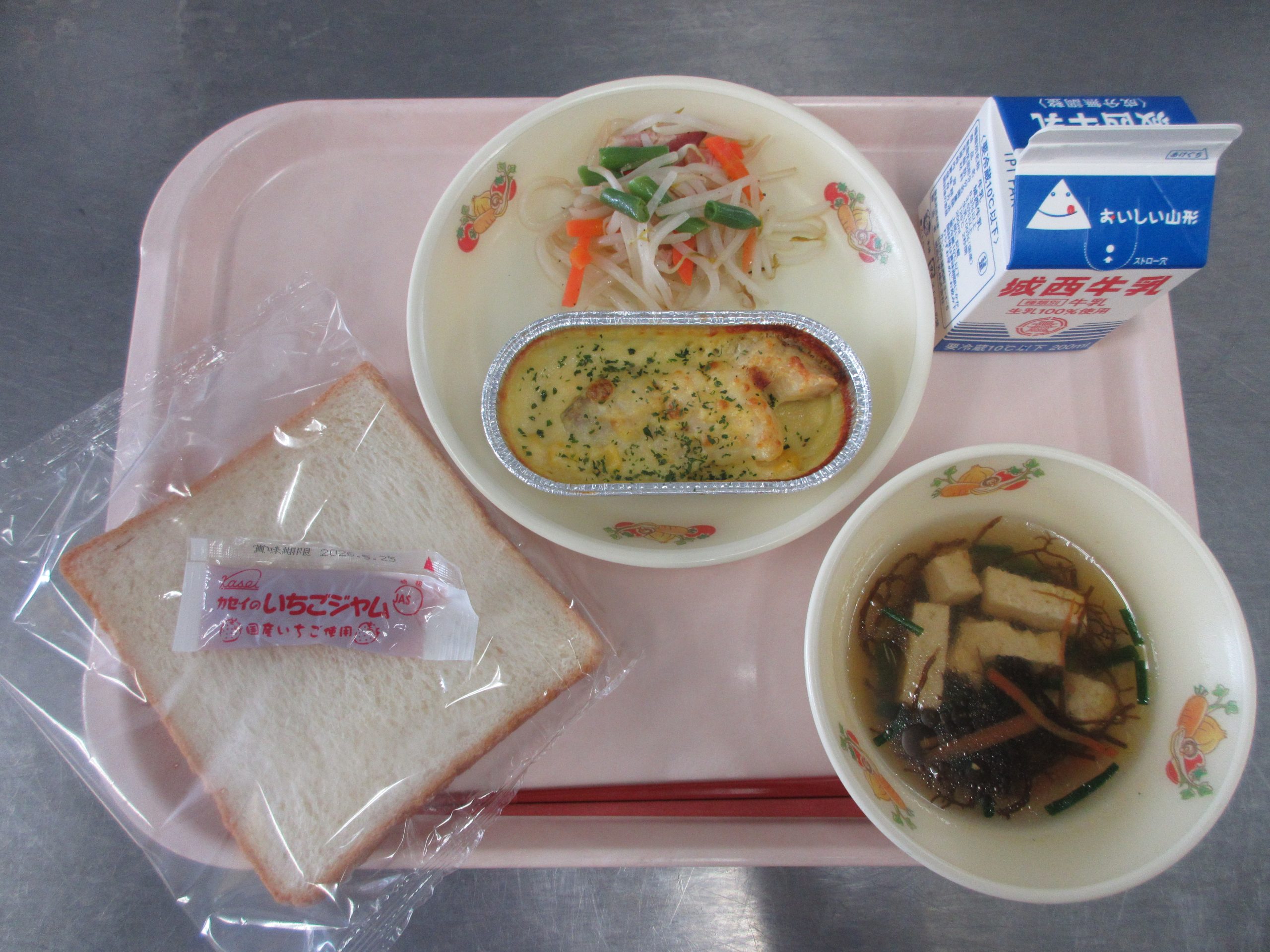 今日の給食は 食パン、白身魚のコーン焼き、もやしのソテー、もずくスープ、いちごジャム、牛乳 です。