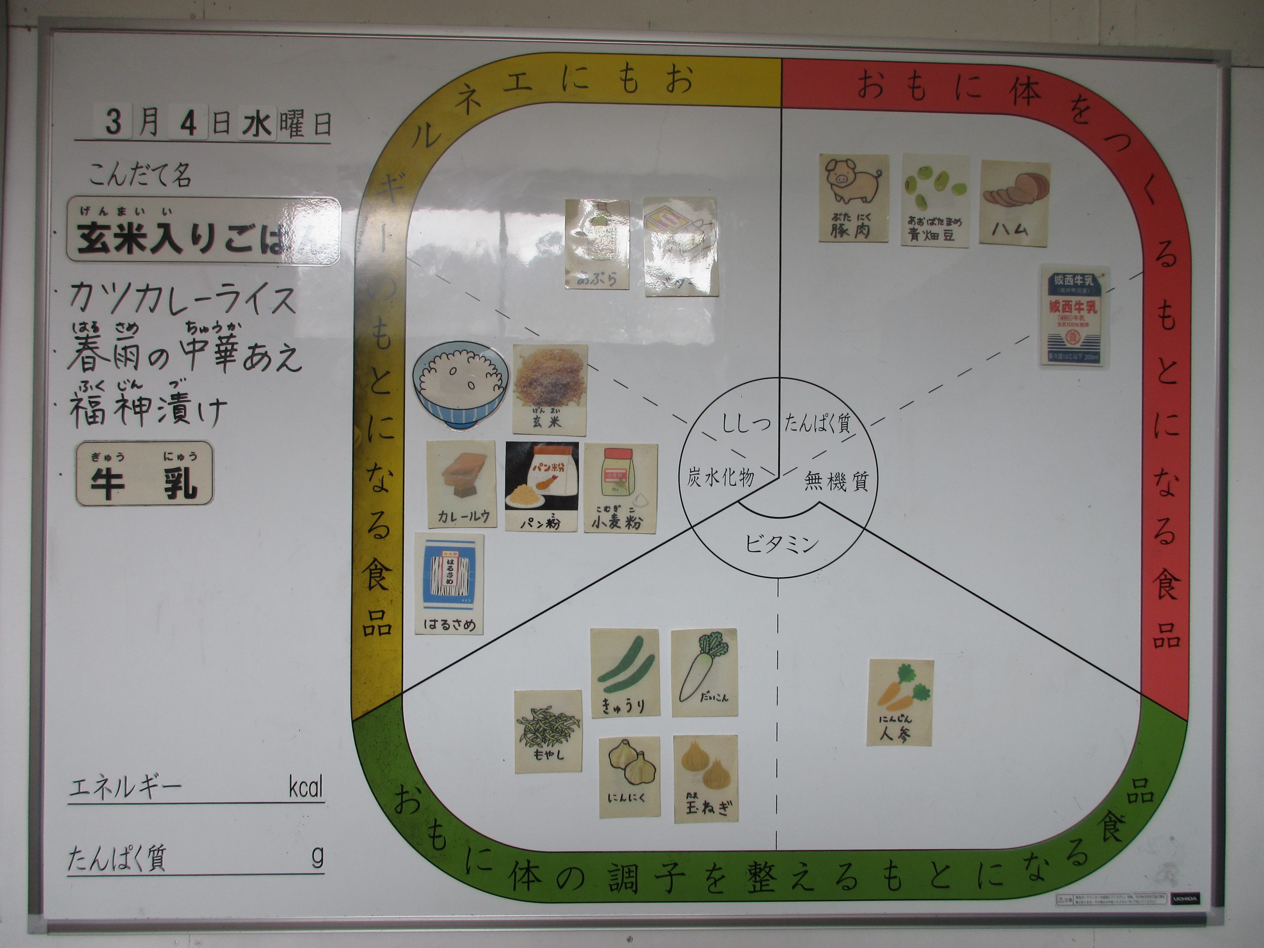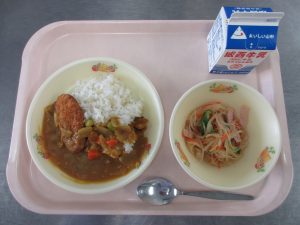 今日の給食は 玄米入りご飯、カツカレーライス、春雨の中華あえ、福神漬け、牛乳 です。