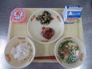 今日の給食は ご飯、手作りハンバーグ、ひじきのサラダ、青菜のスープ、お祝いゼリー、牛乳 です。