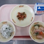 今日の給食は ご飯、鶏肉とカラフル野菜の炒め物、もずくのすまし汁、ふりかけ、牛乳 です。